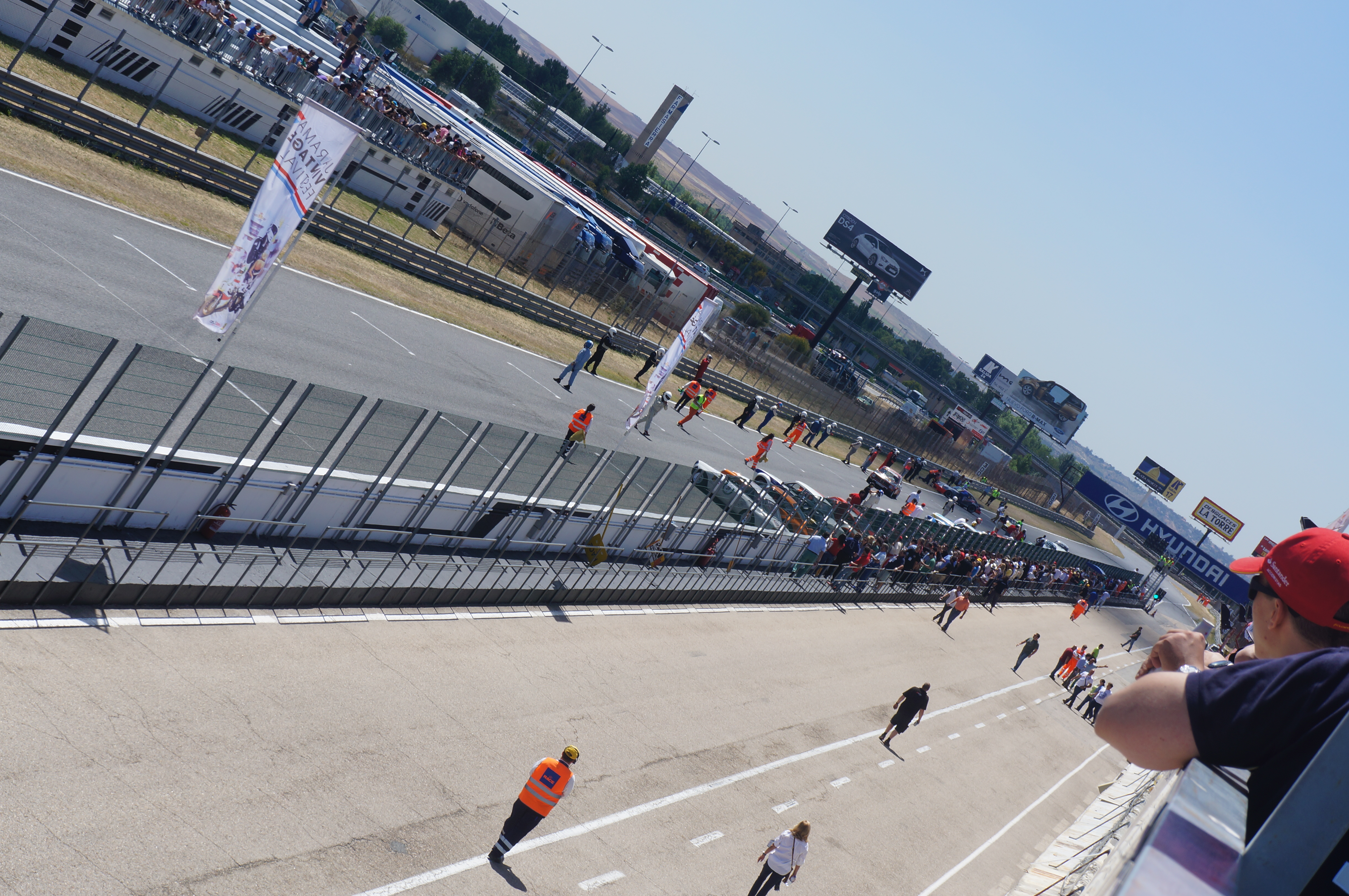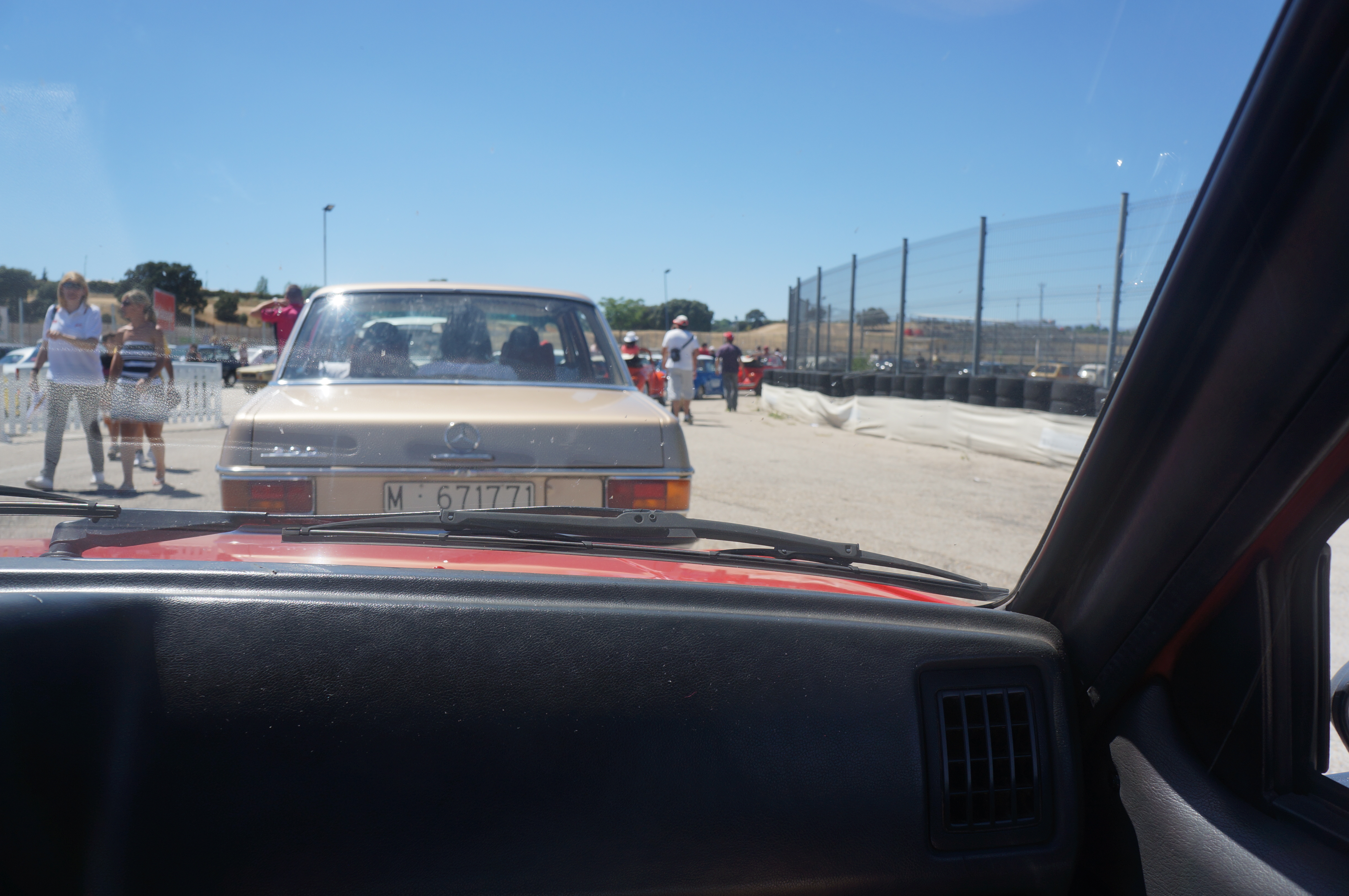 Entramos en el circuito y una amable srta verifica el coche y nos coloca una pegatina en el parabrisas ,no será la única pues minutos más tardes una sencilla banda morada en la luna nos señalará como coche para correr en pista , quedan seis horas para tal fin .