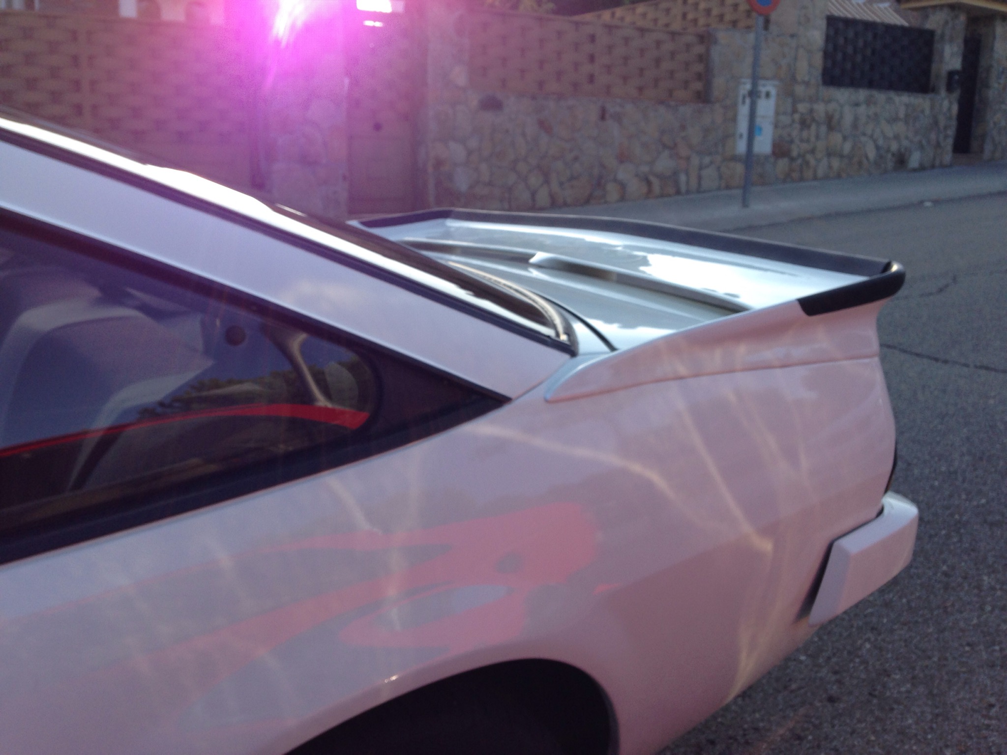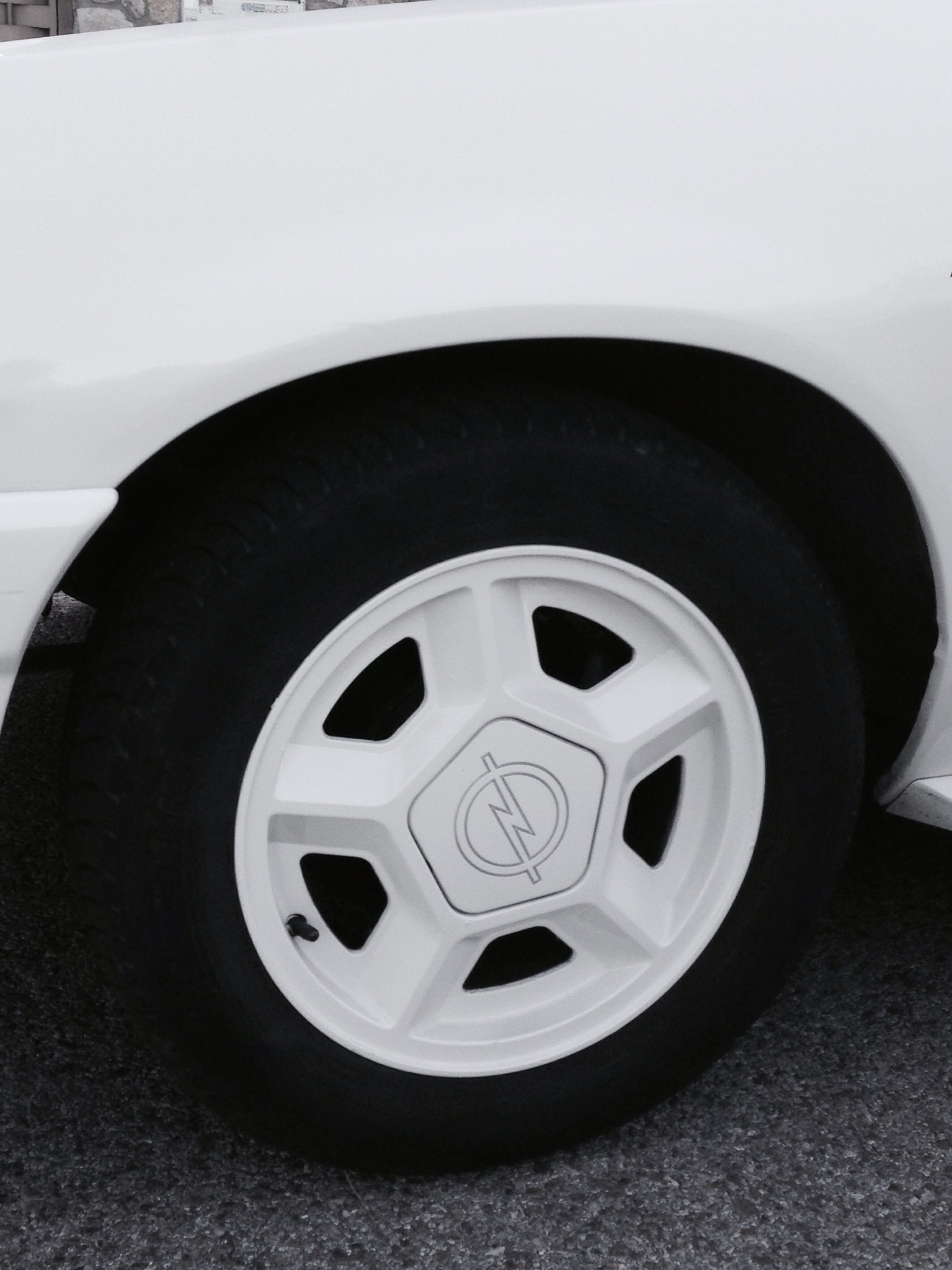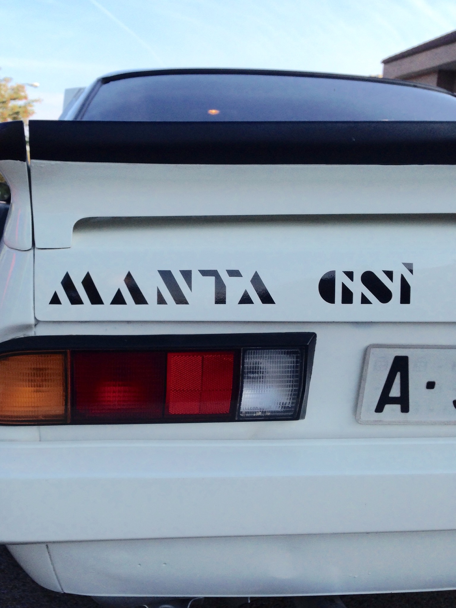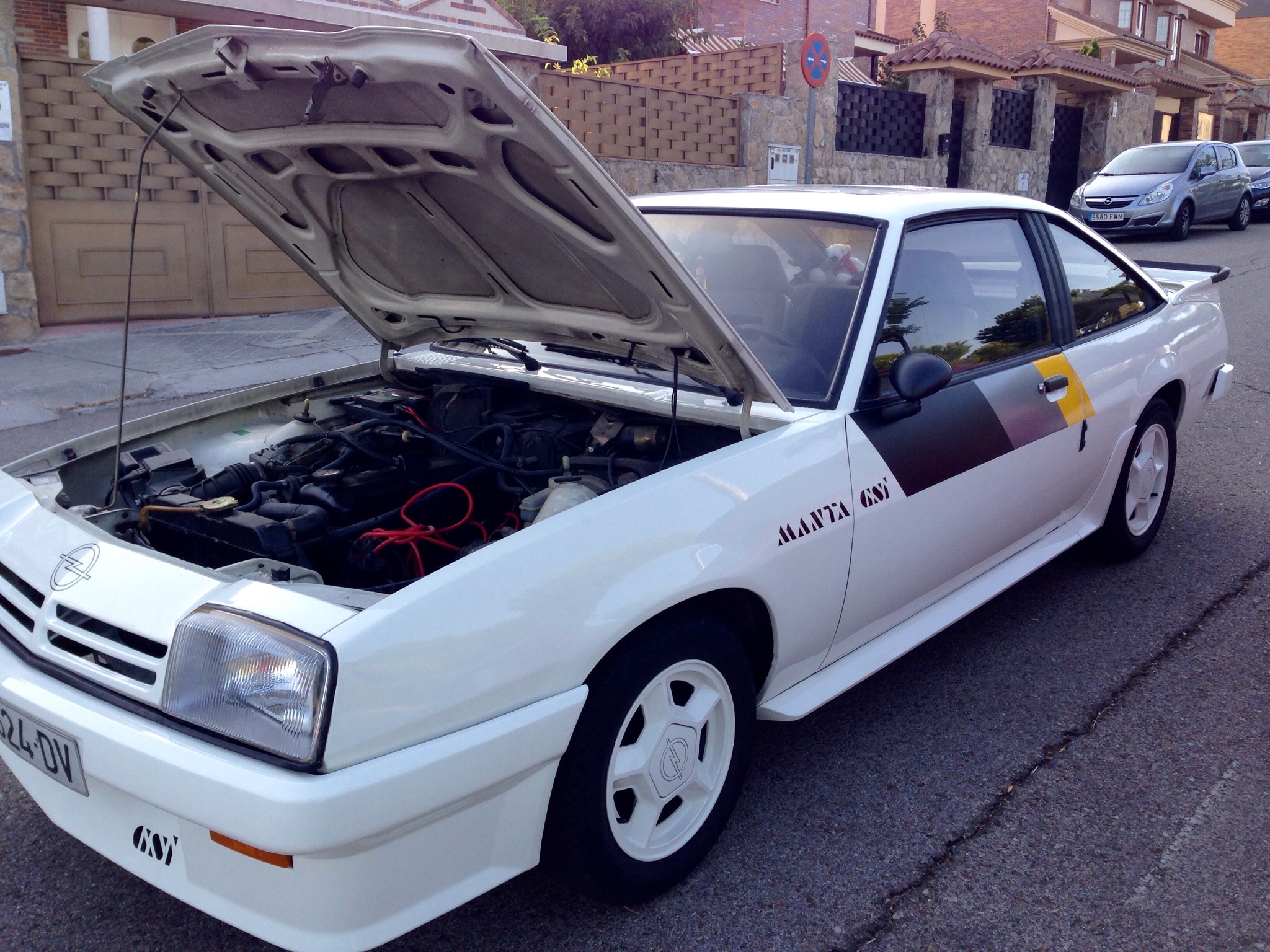 9:30 de la mañana , frío despertar de octubre , terminamos de sacar nuestro Kadett del garaje y hay está : un frontal agresivo , pintura blanca y las pegatinas decoración del equipo de competición Opel en puertas y maletero .