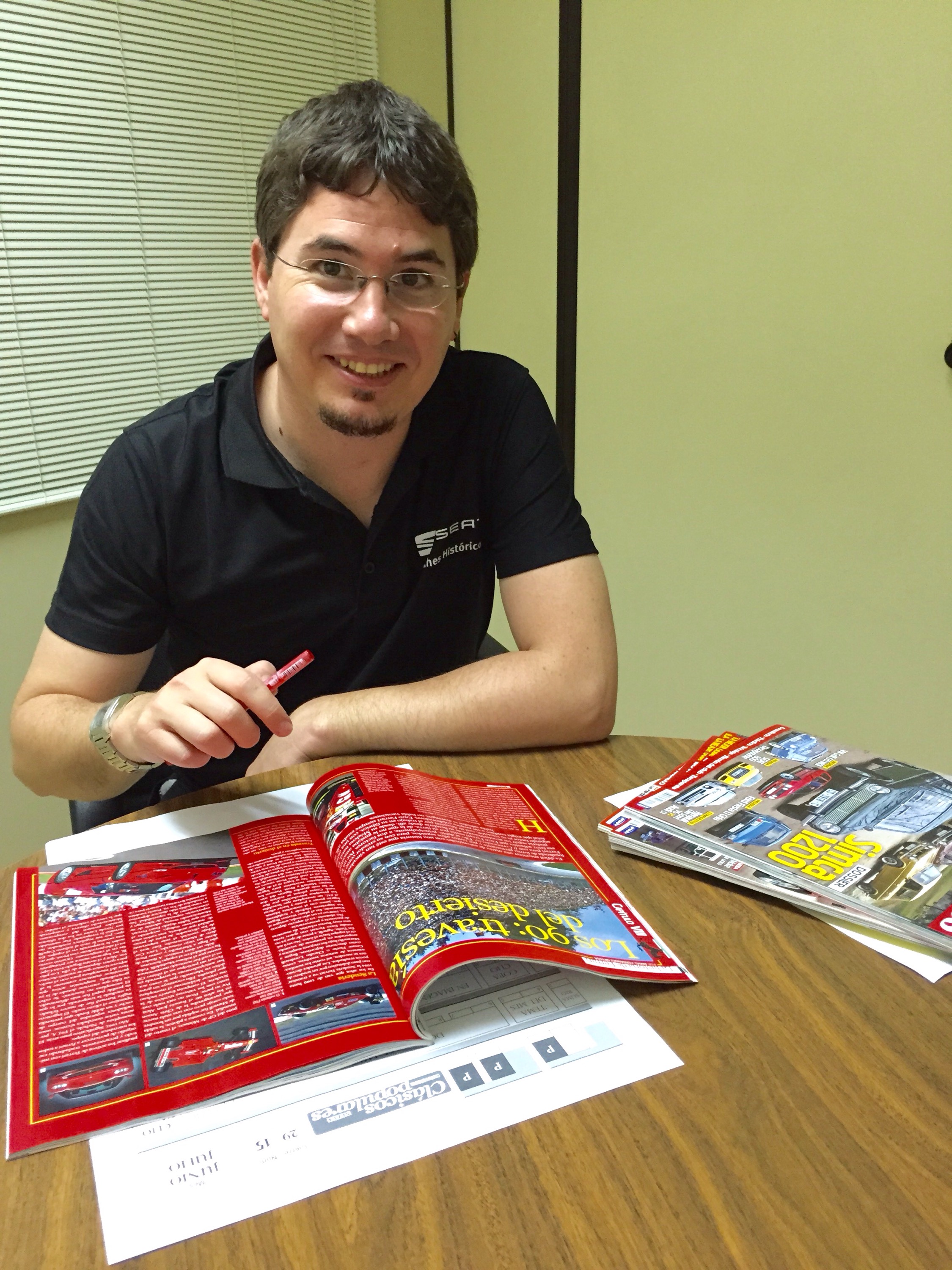 Unos Jeans un polo de Seat Clásico y muchísimos libros y revistas para cultivarse en su trabajo y afición (bueno y alguna maqueta a escala también ocupa su mesa) afición curiosa ;nos confesó, que nadie en su familia es aficionando al motor . Resulta que desde muy pequeño ya dibujaba coches y escribía pruebas sobre ellos y como narra el dicho » el que la sigue la consigue » se especializó en periodismo del motor lo que le abrió la puerta del puesto que ocupa hoy .