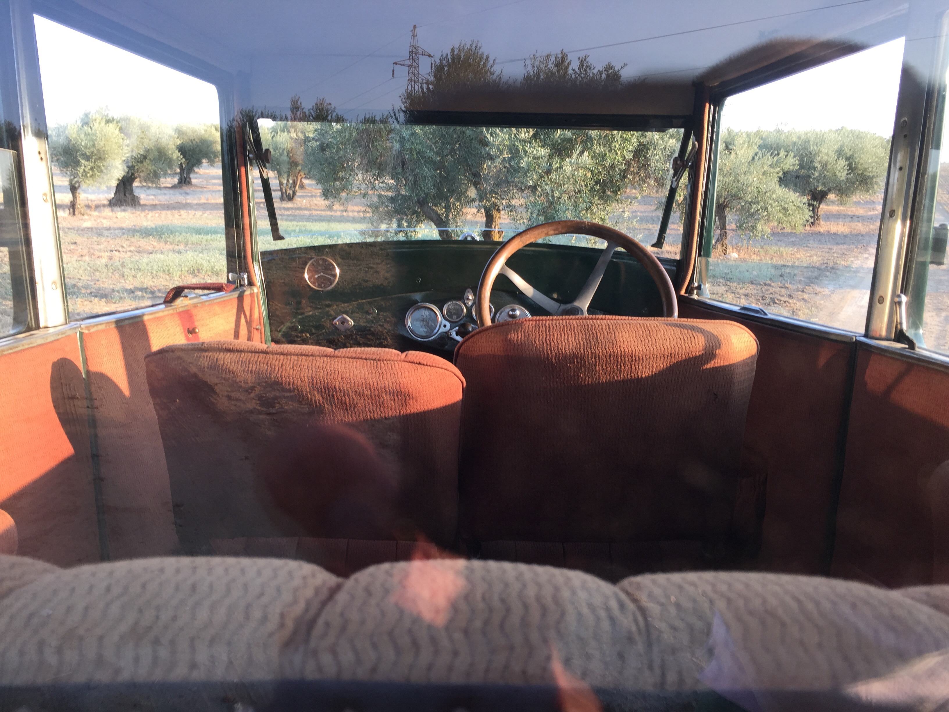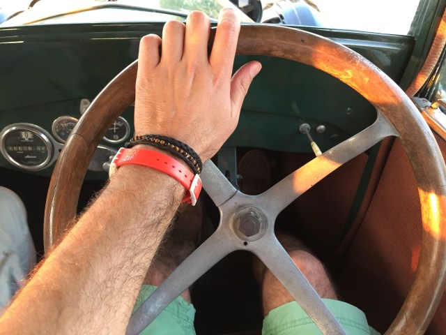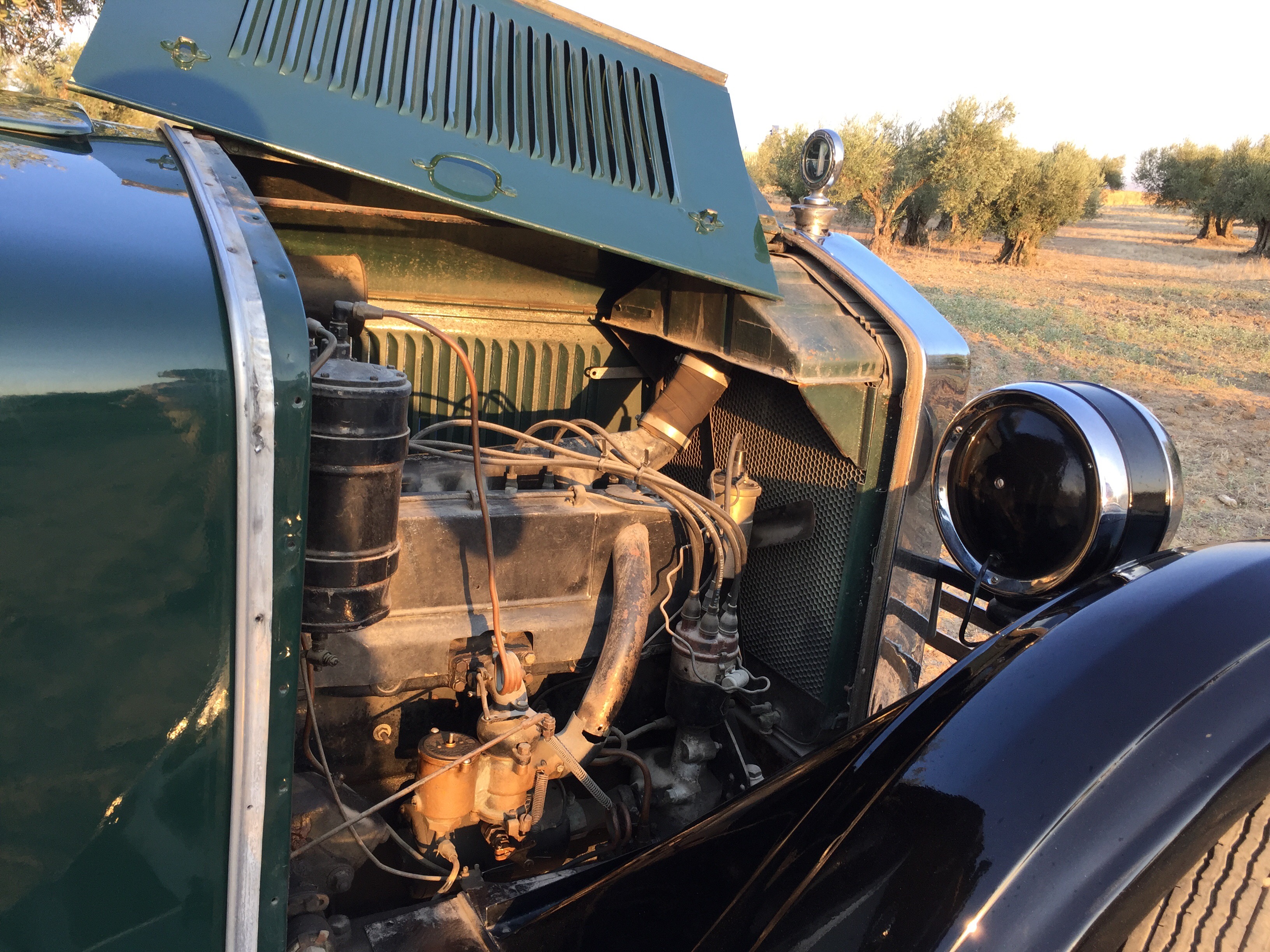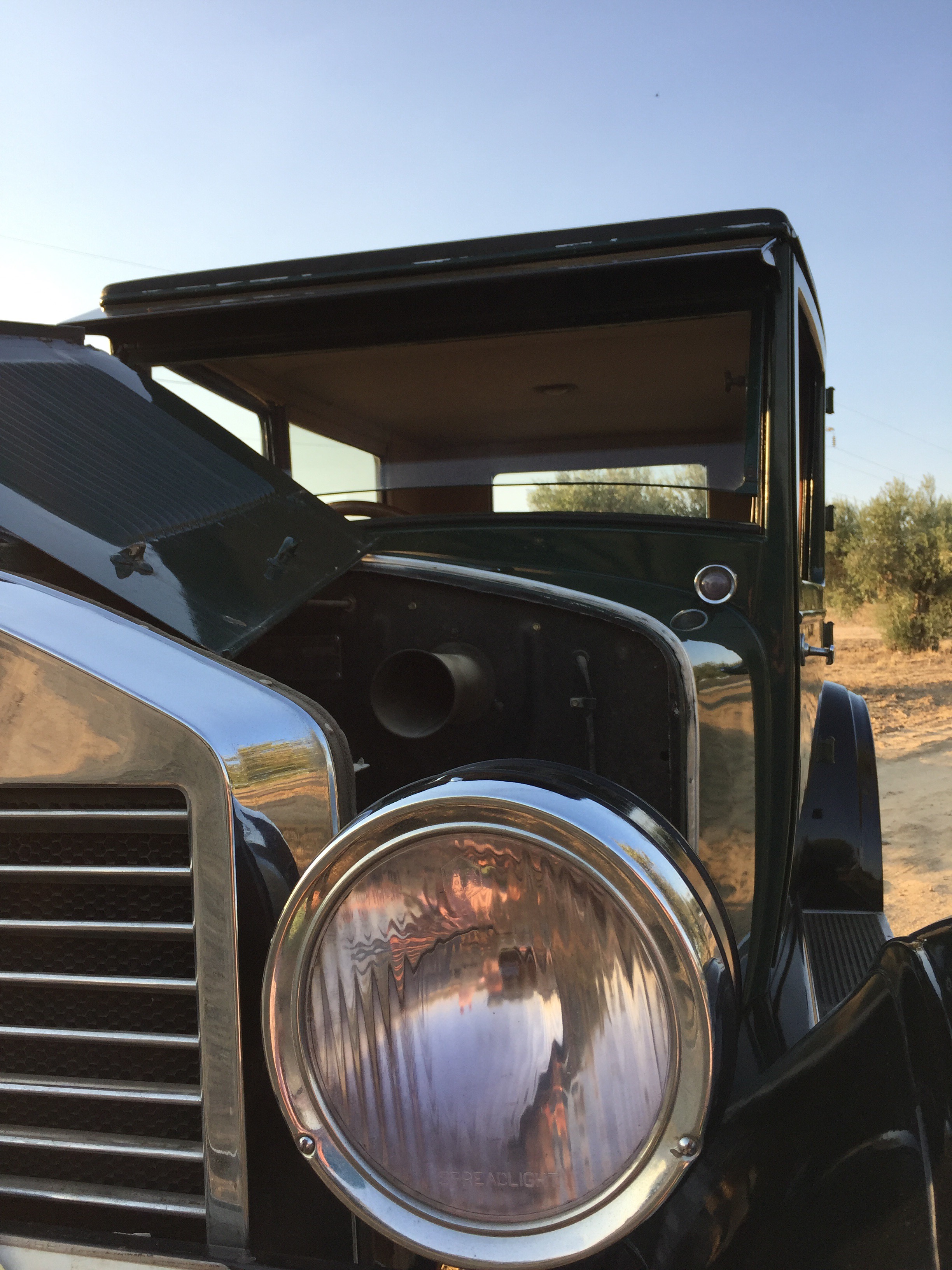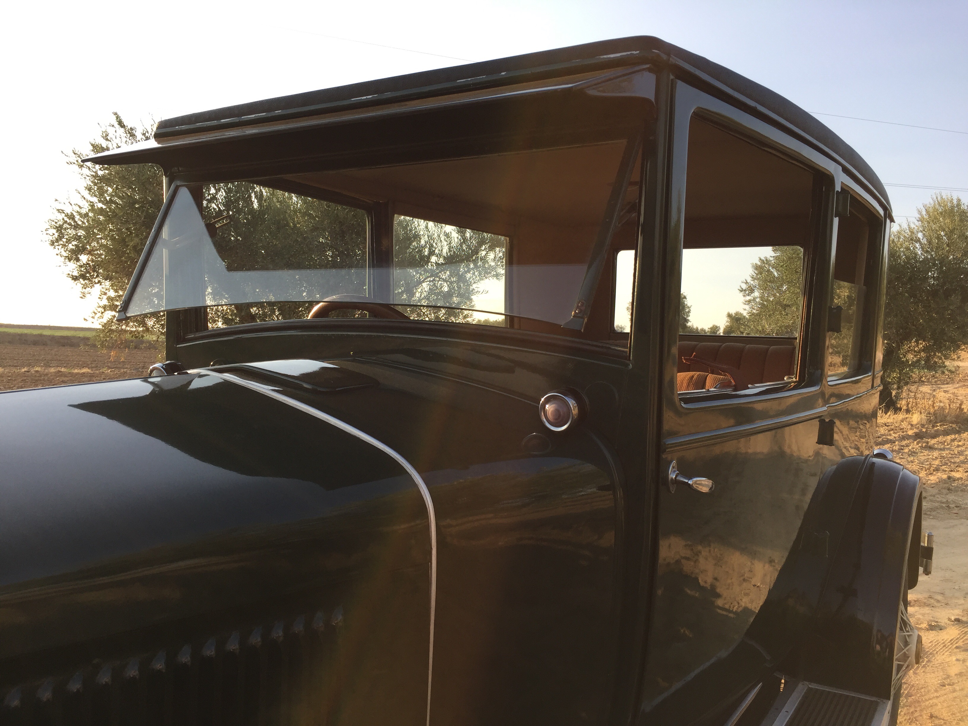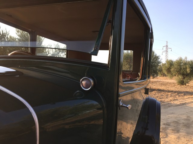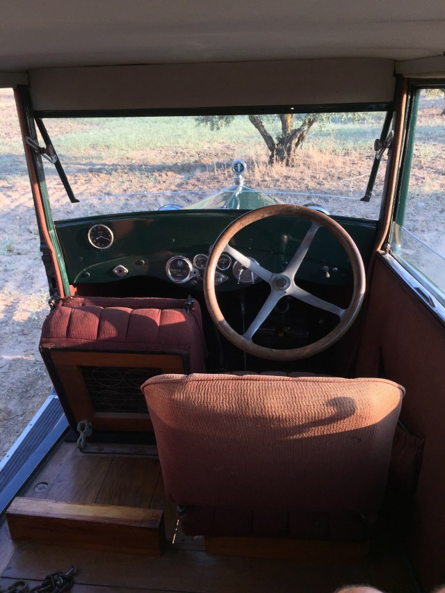 Un volante grande , un interior lleno de curiosidades por la simpleza de las mismas como los alza cristales tipo tren o un cuenta kilómetros con mucha personalidad .Piso de madera , ruedas de radios, un termómetro que marca la temperatura del motor presidiendo el inmenso capot como si del escudo se tratase , asientos mullidos y cómodos y … la bocina con ese tipo de sonido que imaginarías para un coche de esta época ¡ que sensación tan mágica !.