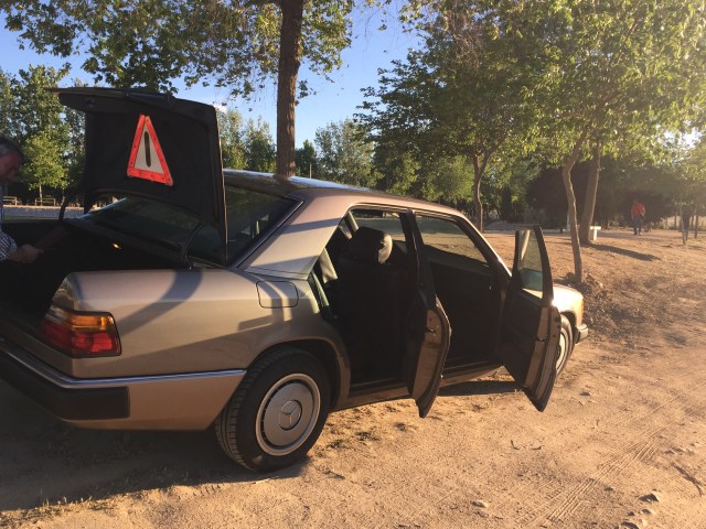 Volviendo a donde estábamos , el coche , un flamante 300 d de origen alemán ( de cuando en los 80 se traían coches importados , los de las placas verdes ¿ os acordáis ? Luce un precioso marrón impala metalizado y unas fundas que aunque restan originalidad al coche , cubren una tapicería azul nueva .