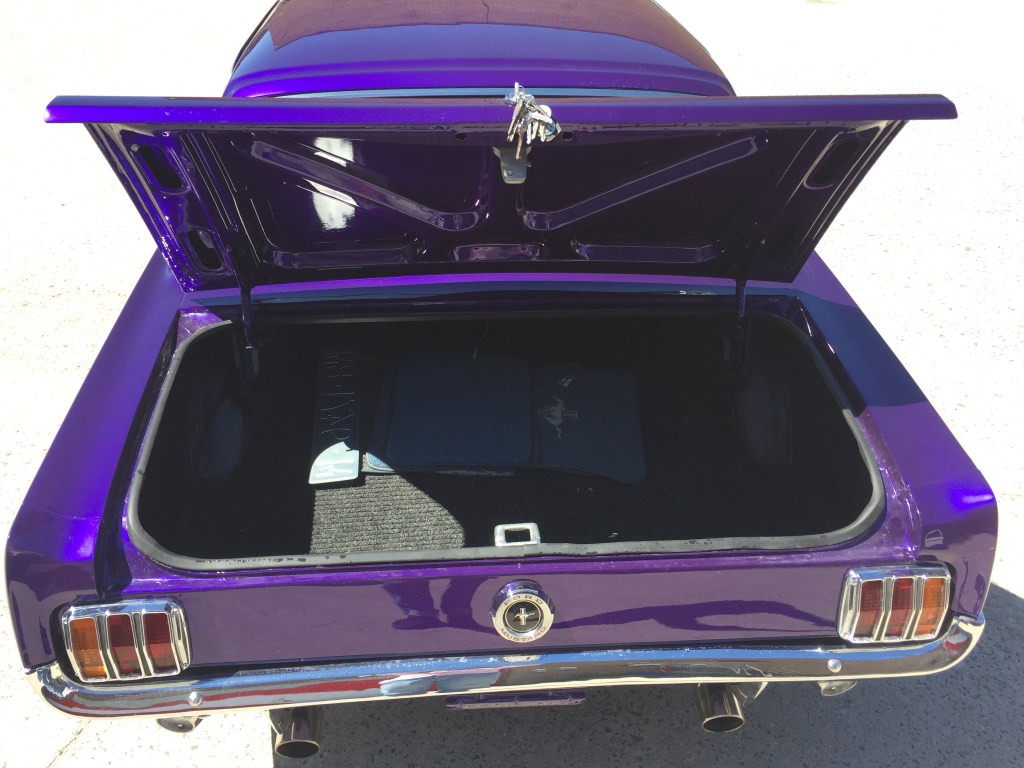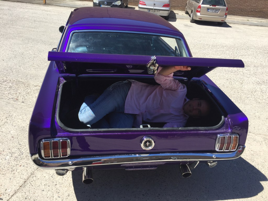 Y la respuesta es si , cabe un cuerpo en el maletero de un mustang del 65 , jajaja , pero ojo , que como se cierre la puerta estás perdido , no puedes acceder al coche .