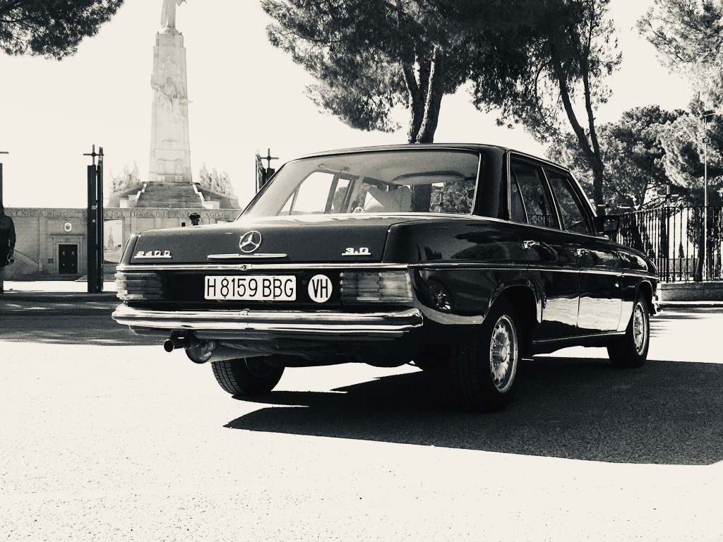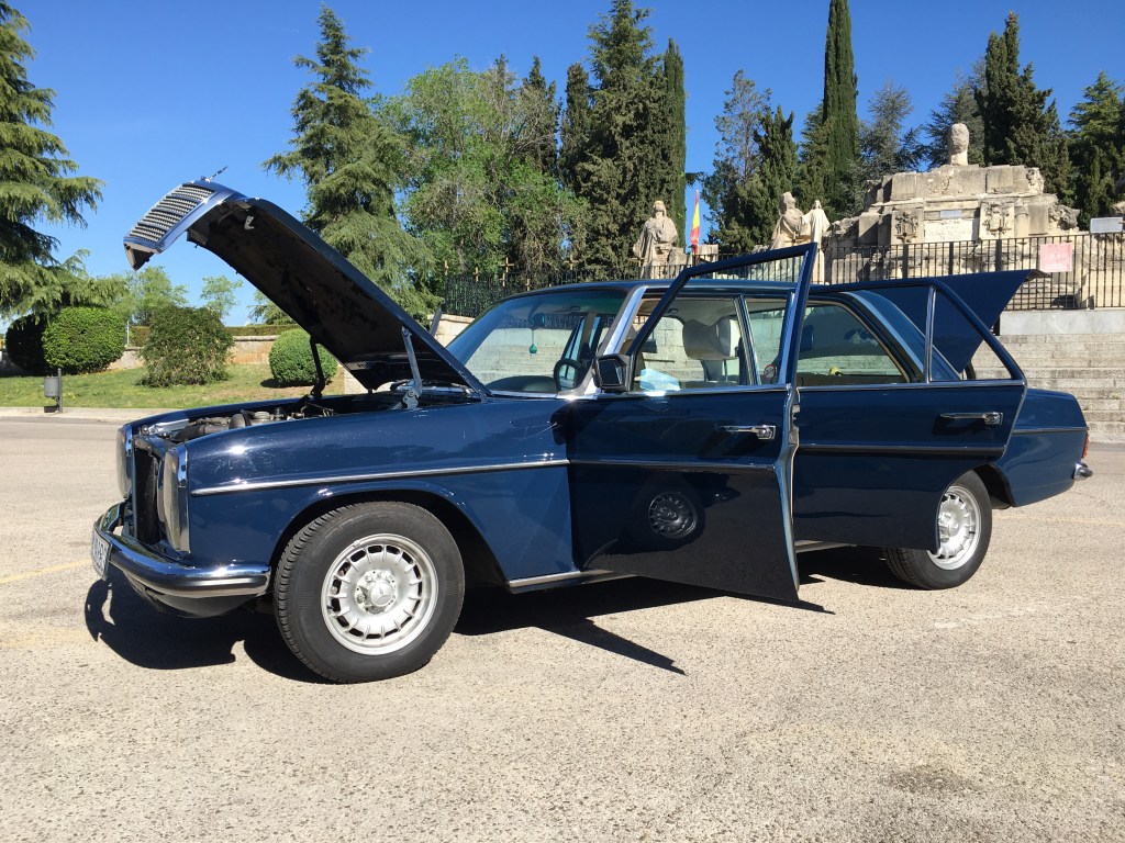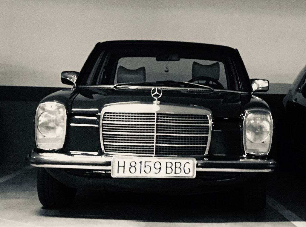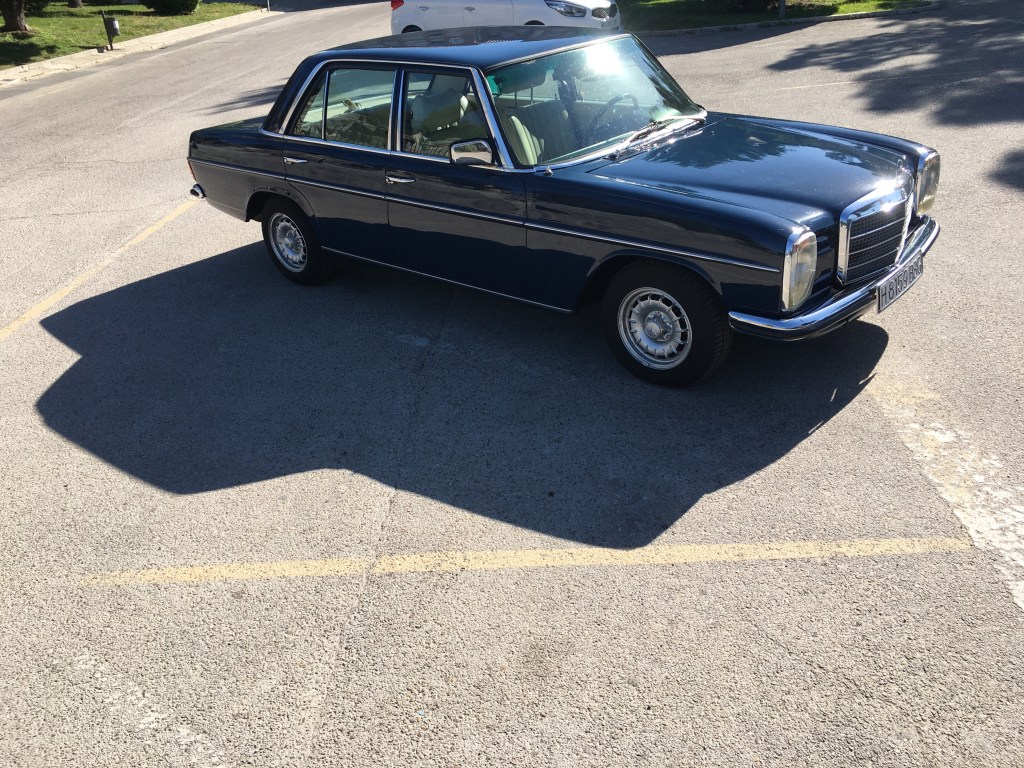 Primera hora de la mañana , Espero fumando un cigarro a que llegue Alberto cuando …. En medio de coches SUV híbridos y eléctricos , aparece el precioso w115.
