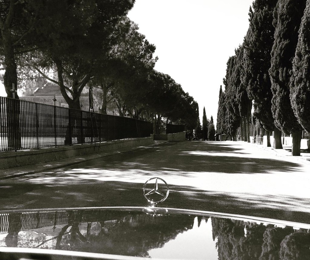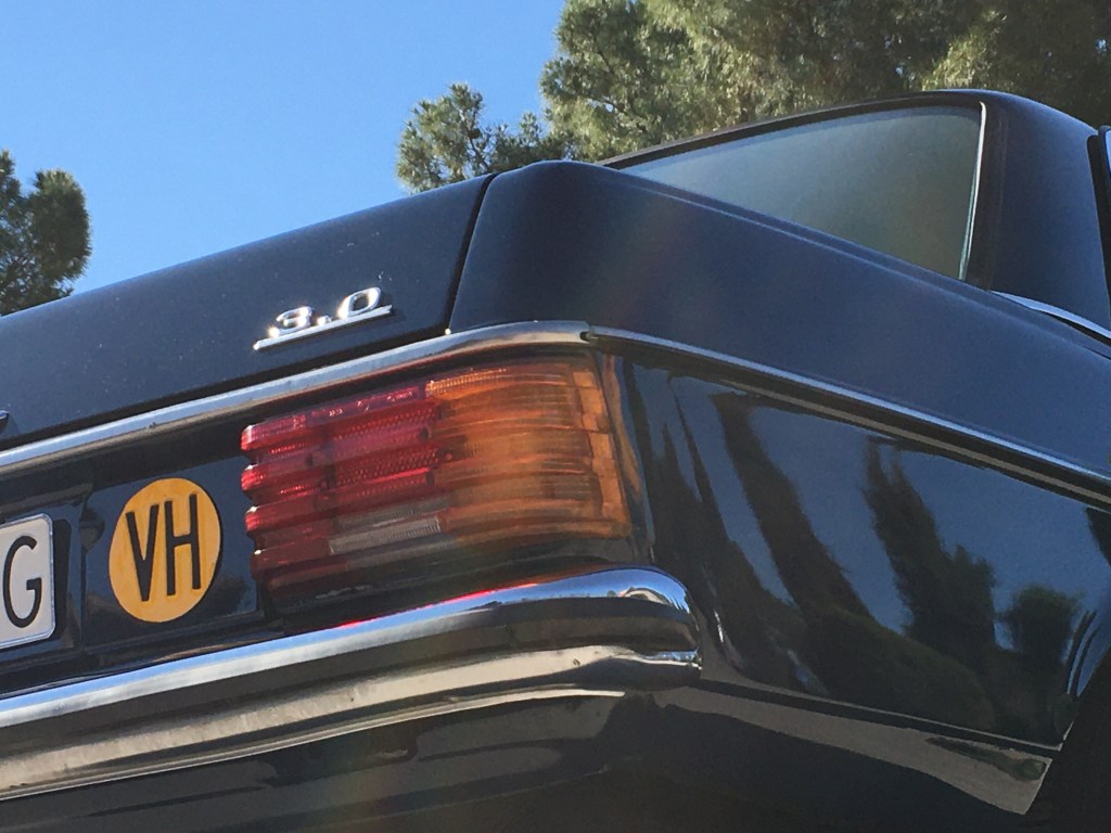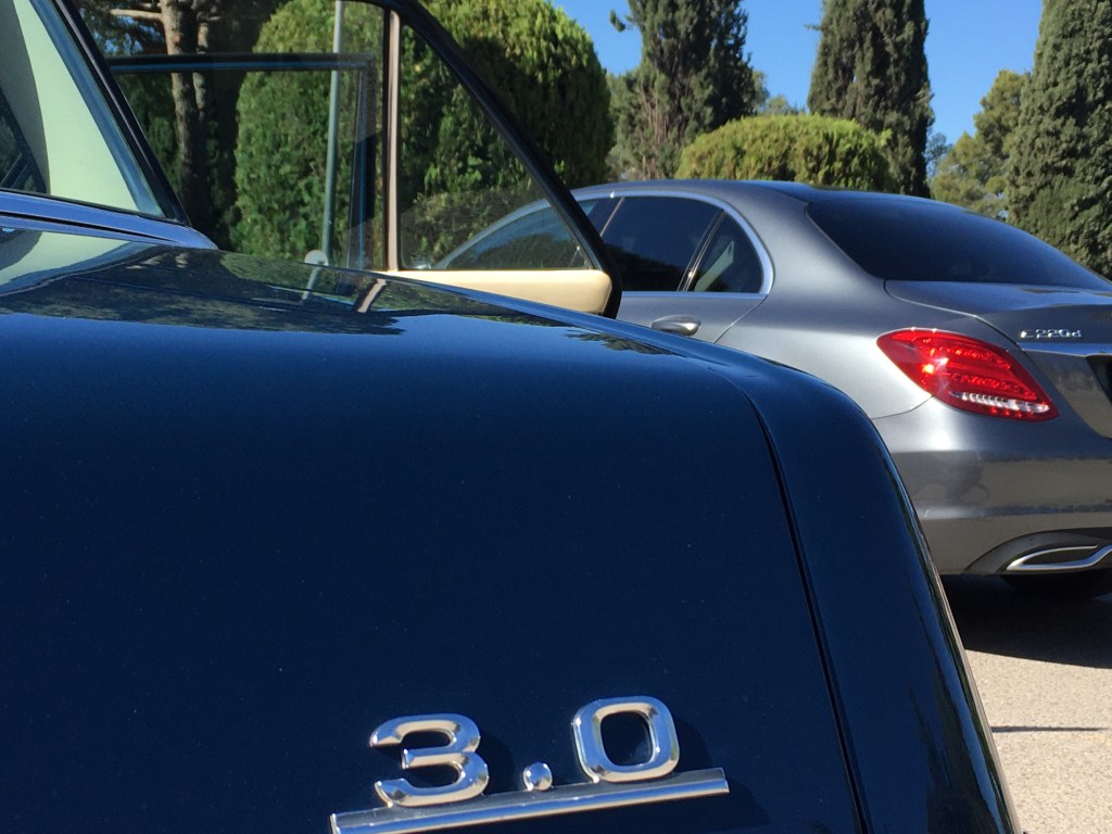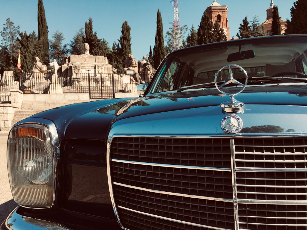 Primera hora de la mañana , Espero fumando un cigarro a que llegue Alberto cuando …. En medio de coches SUV híbridos y eléctricos , aparece el precioso w115.